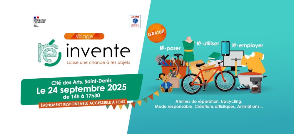 Le mercredi 24 septembre, de 14h00 à 17h30, le Village Ré-invente prend place à la Cité des Arts, dans le Hall Fanal à Saint-Denis.Cet événement, initié par l’ADEME, met à l’honneur les 3R de l’Économie Circulaire : Réparer 🔧 – Réutiliser 🔄 – Réemployer ♻️.